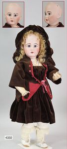 STEINER französisches Bébé, A. Steiner, Biskuitporzellan-Kurbelkopf, Nackenmarkierung STEINER A. 1, ca.1880, blaue feststehende nicht Orig.- Glasaugen, geschl. Mund, Orig.-Papiermaché- Kopfdeckel, französischer Gliederkörper mit festen Handgelenken, alte Echthaarperücke, mit alter Kleidung, Unterwäsche, Schuhe und Strümpfe