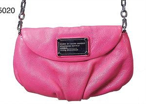 MARC BY MARC JACOBS 1x Damentasche, pink weiches Kalbsleder, mittig silberne Plakette, Verschluss Magnetknopf, Innenfutter schwarz/weißer Stoff, 6 Seitentaschen, 1 langer Schulteriemen mit pinkfarbenem Ledereinsatz/silberner Kettentrageriemen, leichte Abnutzungsspuren am Leder zu sehen, Breite 22 cm, Höhe 14cm,