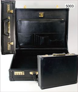MCM Hartkoffer, Designed by Michael Cromer, vergoldete Messingbeschläge, weiches schwarzes Rindsleder, innen mittig goldene MCM Plakette, Nr. Z2055, große Füllfläche, 1 lange Seitentasche für Akten, 3 Stifthalter, 1 Handyhalter, 2 kl. Kreditkartenhalter, 1 x Reißverschluss, Innenfutter orangefarbene Seide, mit Logoprint, unten 4 Füße, Ecken am Koffer, Leder verstärkt, 47 cm breit, 37 cm hoch, 13 cm tief, leichte Gebrauchsspuren außen