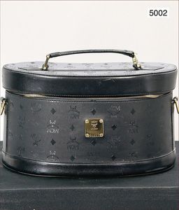 MCM München Kulturkoffer, mittig goldene MCM Plakette 04407, schwarzes Logoprint, 1 Trageriemen aus schwarzem glatten Leder, vergoldete Messingbeschläge, Unterseite mit 4 Füßen, Innenfutter schwarzes Leder, 1 Spiegel, altersbed. Flecken im Spiegelglas, 1 langer Trageriemen, Leder mit Kräuselband, zum Befestigen von Parfumflacons, Breite 25 cm, Höhe 21 cm, Tiefe 23 cm, schöner Orig.-Zust.