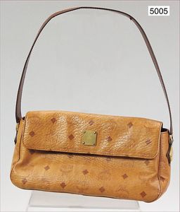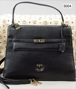 MCM München klassische Damentasche, Typ Kelly Bag, mittig vergoldete MCM Plakette M9850, schwarzer Leder-Trageriemen, vergoldete Messingbeschläge, Schloss mit Ledereinsatz, dazu Lederetui für Schlüssel (2 Schlüssel), unten 4 Füße, Innenfutter weiches beigefarbenes Wildleder, gr. Fülltasche, seitl. 1 Seitentasche, 1 Seitentasche mit Reißverschluss, innen geprägtes Leder Genuine handcrafted product, dazu 1 abnehmbarer Leder-Schulterriemen, Größenverstellbar, 26 cm hoch, 38 cm breit, 15 cm tief, im Orig.-Staubbeutel, minim. Abnutzungsspuren an der Unterseite (Kante), sonst feine klassische Damentasche, ausgef.