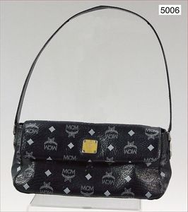 MCM München schwarze Damenhandtasche, Leder, mit grauem MCM Monogramm, mittig goldene MCM-Plakette, gemarkt G3845, innen mit Magnetknopf, glattes schwarzes Leder, Innenfutter Stoff mit MCM Muster, Genuine handcrafted product, Made in Italy, Nr. 99011, Gebrauchsspuren, 30 cm breit, 16 cm hoch, unten 5 Füße, 1 langer Trageriemen, Leder, leichte Abnutzungsstellen innen