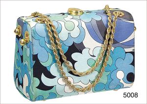EMILIO PUCCI ausgefallene 60er Jahre Hartschalen Tasche, Made in Italy, bunte Seide, in unterschiedl. Blautönen, vergoldete Messingbeschläge, 2 goldene gedrehte Kettentrageriemen, 4 goldene Stellfüße, 18 cm breit, 13 cm hoch, 9 cm tief, innen glattes schwarzes Leder, Seitenschlitz mit türkisfarbener Seide, altersbedingt leichte Gebrauchsspuren