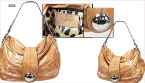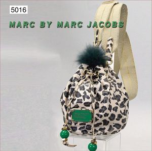 MARC BY MARC JACOBS ausgefallene Damentasche in Sackform, Leder mit Leoprint, Größen verstellbarer Stoffschulterriemen, grüne Plakette auf Frontseite, Innenfutter Stoff braun, große Fülltasche, seitlich eine Seitentasche mit Reißverschluss, 21cm breit 18 cm hoch, Verschluss mit einem ledernen Band, an beiden Enden mit grünen Perlen verziert