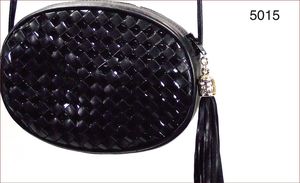 COSCI Geflochtene runde Damentasche, handmade in Italy, Leder, schwarz, 19 cm breit, 14 cm hoch, 1 langer lederner Schulterriemen, mittig gr. Fülltasche, seitl. 1 Seitentasche mit Reißverschluss, vergoldete Messing Beschläge, 1 Anhänger mit schwarzen Lederfransen, sehr guter Zust.