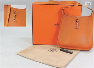 HERMÈS Typ Evelyne III, in der typischen Farbe orange, Jungstierleder, Stofftrageriemen, goldene Metallbeschläge, geprägt mit Hermès, Höhe 30 cm, Breite 28 cm, Tiefe 7 cm, teilw. an den Ecken leichte Abnutzungsspuren sowie Gebrauchsspuren am Innenfutter, in Orig.-Staubbeutel sowie Orig.-Kart., Hermès Paris Faubourg Saint-Honoré