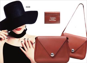 HERMÈS Damenhandtasche, Jungstierleder, kaminrot, mit Klappe, runder Zifferbeschlag mit Hermès Paris Prägung, innen kaminrot, Aufschrift "Hermès Paris Made in France", langer lederner Trageriemen, 36 cm breit, 29 cm tief, im Orig.-Staubbeutel sowie Orig.-Kart., Hermès Faubourg Saint-Honoré Paris, neuwertig