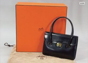 HERMÈS Leder-Damenhandtasche, dunkelblau, älteres Modell, ca. 1980, gemarkt Hermès Paris, 2 gr. Innentaschen, seitl. eingenähtes Portemonnaie, glattes Leder, Drehverschluss, 2 Trageriemen, 23 cm breit, 16 cm hoch, bis auf kl. Abnutzungsspuren in gutem Zust., dazu Orig.-Staubbeutel, im Orig.-Kart., Hermès Paris Faubourg Saint-Honoré