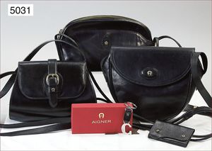 ETIENNE AIGNER Konv., 3 Damen-Handtaschen, ca. 90er Jahre, 1 x modische schwarze Umhängetasche mit Klappe, vorne Messing/Blech vergoldete Schnalle, Magnetdruckknopf, 15 cm hoch, 20 cm breit, größenverstellbarer lederner Trageriemen, Innenfutter extrem weiches beigefarbenes Rindsleder, seitl. 1 Seitenfach mit Reißverschluss, 1 x halbrunde Damen-Handtasche mit größenverstellbarem Trageriemen, schwarzes glattes Leder, Magnetknopf, Innenfutter weiches beigefarbenes Rindsleder, 18 cm hoch, 22 cm breit, dazu 1 Tragetasche, teilw. ein paar Abnutzungsstellen, 1 x Schlüsseletui, gemarkt Etienne Aigner Made in Italy, 9 cm, 1 x Aigner Schlüsselanhänger, im Orig.-Kart., mit schwarzem Glattleder, silberfarbene Beschläge