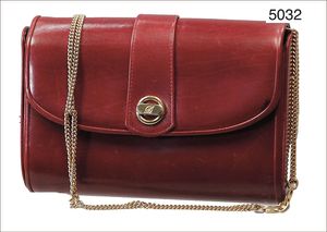 DUCALE Italy, Abendtasche, bordeauxfarbenes weiches rotes Leder, 12 cm breit, 14 cm hoch, Druckknopf, Innenfutter schwarzes Glattleder, goldfarbener Kettentrageriemen, im Orig.-Staubbeutel, ca. 1970, leichte Abnutzungsspuren