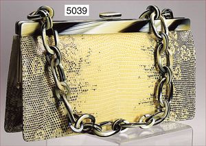 GIORGIO ARMANI kl. Damen-Handtasche in Echsenmotiv, 25 cm breit, 14 cm hoch, 11 cm tief, 2 kurze Trageriemen, silberne Messingbeschläge, graviert Giorgio Armani, seitl. Vorder- u. Rückseite 2 kl. Seitentaschen, Innenfutter beigefarbenes Wildleder, innen gr. Fülltasche, seitl. Seitentasche mit Reißverschluss, neuwertiger Zust.