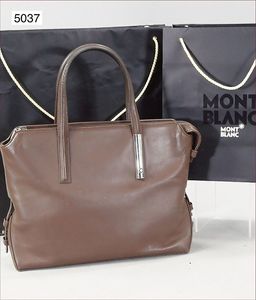 MONT BLANC Damen-Handtasche, braunes weiches Kalbsleder, 2 Trageriemen, silberfarbene Messingbeschläge, 22 cm hoch, 29 cm breit, Innenfutter beigefarbenes Wildleder, gr. Fülltasche, seitl. 1 Handytasche, 1 Stifthalter, seitl. Seitentasche mit Reißverschluss, leichte Abnutzungsstellen, dazu mit Einkaufstasche