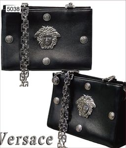 GIANNI VERSACE Damen-Ledertasche, schwarz, Vorderseite mit silbernem Medusa-Kopf, 23,5 cm breit, 16 cm hoch, 2 silberne lange Kettentrageriemen, Innenfutter schwarzes glattes Leder, seitl. Seitentasche mit Reißverschluss, 1 gr. Fülltasche, Silber-Zipper mit Medusa-Kopf, guter Zust., keine Gebrauchsspuren