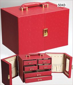 bordeauxfarbenes Straußenleder-Schmuckkästchen, zum Aufklappen, seitl. 2 Spiegel, Haken f. Ketten, 6 Schubladen, mit Schaumgummi-Einlegern f. Ringe, Schnallverschluss vorne, 28 cm breit, 19 cm hoch, 18 cm tief, guter Zust., minim. Tragespuren am Henkel