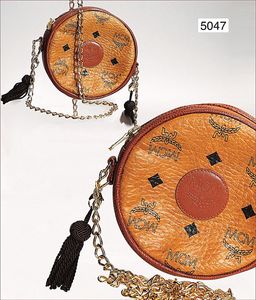 MCM München runde kl. Damentasche, schöner orig. neuwertiger Zust., 13 cm Durchm., klassisches cognacfarbenes MCM Monogrammprint, mit langen goldenen Kettentrageriemen, Anhänger für Quasten, dazu beiliegend Orig.-Quasten in schwarz, grün, rot