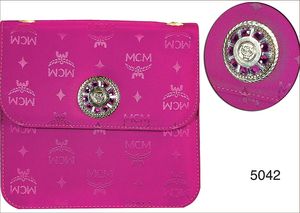 MCM München ausgefallene fuchsiafarbene MCM Tasche, Frontseite mit goldfarbenem MCM Motiv, fuchsiafarbene Strasssteine, 1 langer Schultertrageriemen, 19 cm breit, 18,5 cm hoch, innen gr. Fülltasche mit Seitenfach, neuwertiger Zust.