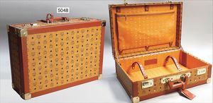 MCM München Reisekoffer, klassisches cognacfarbenes Logoprint, designed by Michael Cromer Nr. 4939A, Messing/Blech vergoldete Beschläge, mit Zahlenschloss, Lederanhänger, sehr schön verarbeitetes Innenfutter, 2 cognacfarbene Leder-Innenschnallen, 1 Seitentasche mit Reißverschluss, sehr schöner Orig.-Zust., 58 cm breit, 12 cm tief, 40 cm hoch