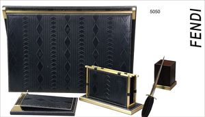 FENDI Schreibtischset, schwarzes imprägniertes Leder, gemarkt Fendi Roma Made in Italy, 1 x Briefhalter, Länge 24 cm, Breite 10 cm, Höhe 13 cm, 1 x Schreibunterlage mit Blättern, 53 cm lang, 35 cm hoch, 1 Scheck-Etui, 23 cm breit, 16 cm hoch, 1 Brieföffner, etwas Zinkpest, 1 Stifthalter, ausgefallen