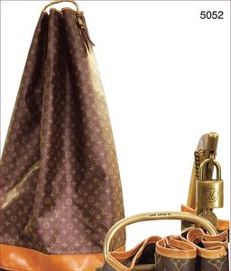 LOUIS VUITTON Sac de voyage, gr. Seesack, Monogram canvas, Höhe 77 cm, Breite 63 cm, Unterseite naturfarbenes Leder, Innenfutter Stoff, Messingriemen, mit Orig.-Schloss u. Schlüssel, Louis Vuitton Paris, dieser Artikel wurde nur auf Anfrage hergestellt