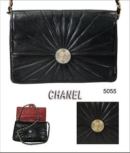 CHANEL kl. klassische Ledertasche, Vintage Chanel Paris, mittig goldfarbenes rundes Löwenmotiv, Innenfutter bordeauxfarbenes glattes Leder, gr. Fülltasche, 2 Seitenschlitze mit Fach für Lippenstift, seitl. 1 Seitenfach mit Reißverschluss, Druckknopf-Verschluss, 1 langer Kettentrageriemen verknüpft mit Lederband, 22 cm breit, 14 cm hoch, minim. Abnutzungsspuren (altersbed.)