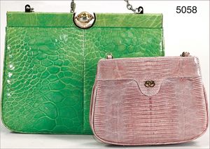 MODELL ROYAL Konv. 2 Damen-Handtaschen, 1 x Modell Royal, altrosefarben, Abendtasche, 18 cm breit, 13 cm hoch, Kettentrageriemen, Innenfutter weißes weiches Kalbsleder, 1 gr. Fülltasche, 1 Seitentasche, dazu 1 grasgrüne Damentasche, 26 cm breit, 21 cm hoch, gemarkt Mädel, innen weiches grünes Leder, gr. Fülltasche, seitl. 2 Seitentaschen, 1 x mit Reißverschluss