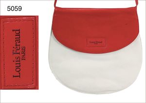 LOUIS FÉRAUD Paris, beige/rot, mit Druckknopf, innen beigefarbener Leinenstoff, bedruckt Louis Féraud Paris, 18 cm hoch, 20 cm breit, 2-facher langer Schultertrageriemen