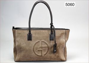 GIORGIO ARMANI Shopper, hellbraunes Wildleder, abgenähtes geprägtes Zeichen auf der Frontseite, 2 lederne Trageriemen, 4 Füße unten, Innenfutter schwarzer Stoff, gr. Fülltasche, seitl. Seitentasche mit Reißverschluss, Lederzipper, innen Messingbeschlag Giorgio Armani, mit Schloss, Schlüssel fehlt, 44 cm breit, 23 cm hoch, 12 cm tief, bis auf kl. Abnutzungsstellen in sehr gutem Zust.
