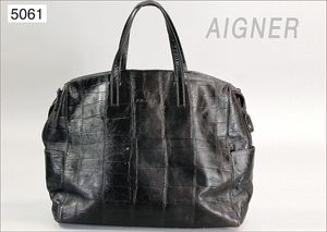 ETIENNE AIGNER gr. lederne Reisetasche, in Kroko-Optik, dunkelbraun, 2 Trageriemen, Aigner eingeprägt auf Frontseite, seitl. 2 Geheimfächer, 5 silberne Füße unten, Innenfutter dunkelbrauner Stoff mit A Zeichen, gr. Fülltasche, seitl. 2 Seitentaschen mit Reißverschluss, Messingbeschlag Aigner München, Made in Italy, 50 cm breit, 35 cm hoch, 22 cm tief, vereinzelt ein paar Gebrauchsspuren, guter Zust.