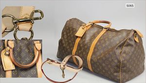 LOUIS VUITTON Reisetasche Keepall, Monogramm Canvas, Besatz aus naturfarbenem Rindsleder, vergoldete Messing Beschläge, Lederzipper, abnehmbarer lederner Adressanhänger, leichte Abnutzungsspuren an dem hellen Rindsleder zu erkennen, 57 cm lang, 35 cm breit, 1 neuer Schultertrageriemen, 2 cm kleiner Riss seitlich neben dem Reißverschluss (Stoff)