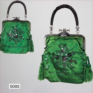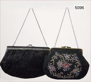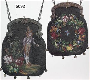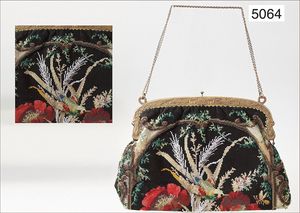 herrschaftl. Damenhandtasche, 1908, ausgefallene Perlenarbeit, auf Frontseite mit Clown, Rückenseite florales Muster mit Schmetterling, ausgefallen filigran gearbeiteter Taschenbügel, gemarkt 1908 M. S., innen Leder, Abnutzungsspuren, 24 cm hoch, 19 cm breit, mit 5 perlenbestickten Kugeln, 1 Kugel fehlt, Kettentrageriemen doppelt, ausgefallen