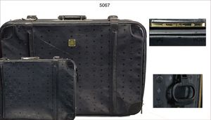 MCM Reisekoffer + Kofferanhänger, designed by Michael Cromer, schwarzes MCM Monogramm, 2 gr. Schnallen mit vergoldeten Messing Beschlägen, außen Klappe mit Druckverschluss, mit ausziehbarer Zugleine, innen MCM Monogramm Stoff, schwarz, teilw. Gebrauchsspuren, guter Zustand