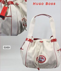 HUGO BOSS gr. Einkaufsshopper, beige, mit rotem Lackleder besetzt, silberner Schriftzug Hugo auf Frontseite, 2 lange Schulterriemen, 3 gr. Fülltaschen, mittig innen silbernes Emblem Hugo Boss 47167, zum Verschließen mit Druckknöpfen, neuwertiger Zust., mit Verkaufsetikett, 5 Silberfüßchen unten, mit Orig.-Stoffbeutel