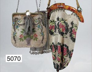 2 Teile, 1x Perlen bestickte Tasche, 1x große Perlen bestickte Biedermeier Tasche, Taschenbügel gebrochen, 23 cm lang, florales Muster, 1x silberne Kettentasche, 22 cm breit, 15 cm hoch, Kettengeldtasche 9 cm,