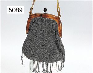 frühe, mit silbernen Perlen bestickte Tasche, Schildpatt-Trageriemen, altersbed. Gebrauchsspuren, sonst gut