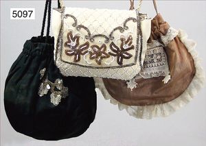 2 Stofftaschen, Stoff Paillettenbesatz, Verschluss (Gummizug wurde nachträglich eingenäht), dazu 1 weiße Damentasche mit Pailletten- u. Perlenbesatz, guter Zust., 14 cm breit, 10 cm hoch
