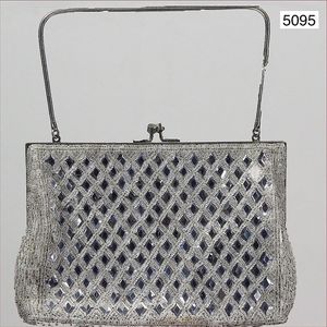 frühe Damen-Handtasche, wohl 30er Jahre, silberner Paillettenbesatz sowie Perlen, silberner Tragebügel, Innenfutter weiche Seide, gr. Fülltasche, seitl. 1 Seitentasche, Orig.-Kettentrageriemen, 19 cm breit, 14 cm hoch