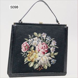 PETIT POINT frühe Damentasche, schwarz, Blumenmuster auf Front u. Rückseite, seitl. abgenähtes Leder, 36 cm breit, 34 cm hoch, 1 lederner Trageriemen, Innenfutter cognacfarbenes Wildleder, gr. Fülltasche, seitl. 1 Seitentasche