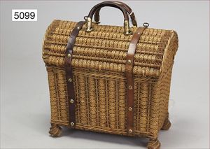 kl. Biedermeier Holz geflochtenes Trageköfferchen, 2 kl. lederne Trageriemen mit 2 Schlüsseln zum drehen u. zum schließen, schöner Orig.-Zust., verstärkt mit goldfarbenen Messing Nieten, 22 cm hoch, 25 cm breit, 15 cm tief, sehr schöner Orig.-Zust., neuwertig