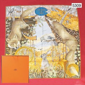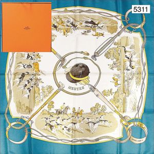 HERMÈS Seidenhalstuch, 1995 Paris, "Chasse au bois", designed by Carl De Parcevaux, Waldszene, im Orig.-Kart., 90 x 90 cm, neuwertiger Orig.-Zust., schöne kräftige Farben, 100% Seide