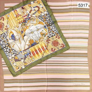 CHRISTIAN DIOR Seidenhalstuch, 75 x75 cm, Farben Pastelltöne, zartrosa, türkis, gelb, braun, gestreift, neuwertiger Orig.-Zust., dazu 1 Bogner Seidenhalstuch, afrikanische Szene/Elefantenszene, 49 x 49 cm, 100 % Seide