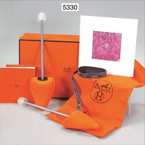HERMÈS Schuhspanner mit Orig.-Karton, dazu 2 Handbücher f. Bindung v. Halsseidenschals, 1 Staubbeutel, Länge 35 cm, neuwertig