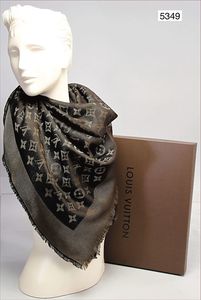 LOUIS VUITTON Damenschal, 1,43 m x 1,43 m, Monogramm Canvas, dunkelbraun/goldfarben, 50% Silk, 30% metal, 20% Wolle, Made in Italy, ausgefallen, neuwertiger Orig.-Zust., im Orig.-Kart.