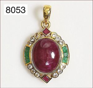 Anhänger, GG 916/000, Rubincabochon ca. 10 ct, 6 Smaragde ca. 0,65 ct, 2 Rubincarres ca. 0,25 ct, 12 weiße Saphire ca. 0,8 ct. H = 35,5 mm