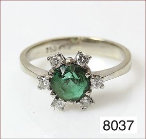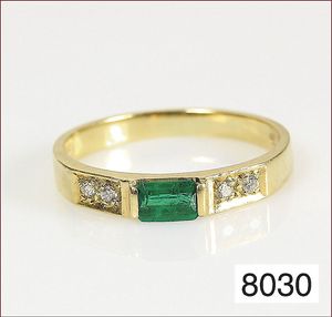 Ring, GG 585/000, Smaragdachteck ca. 4,0 ct dkl. grün, 16 Brillanten ca. 0,88 ct tw/w-vsi, RW ca. 60