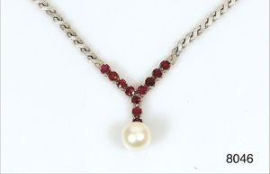Collier, WG 585/000, 11 Rubine, 1 Akoja-Perle, D = 7,6 mm, Kastenschloß mit Sicherheitsacht, L = 42 cm, total 15,0 g