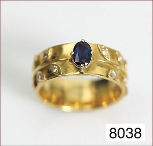 Ring, GG 750/000, 1 Brillant ca. 0,33 ct, tw/w-si, (Natural an einer Facette), 2 Saphir-Dreiecke, RW ca. 50, total 7,2 g