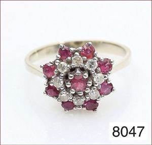 Ring, reicher Diamantbesatz, GG 22 k, 8 Brillanten ca. 0,24 ct, 3 Marquise ca. 0,92 ct, 4 Diamant Tropfen ca, 1,16 ct, 9 Baguettes ca. 0,30 ct, 1 Rubin ca. 0,50 ct, 1 Smaragd-Tropfen ca. 0,40 ct, 1 Saphir 0,6 ct, 1 Perle D = 6,1 mm, Brillanten & Diamanten ca. weiß/get.weiß-vsi/si, total ca. 2,62 ct