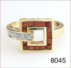 Ring, GG 22 k, 1 Saphir-Rechteck ca. 2 ct, 2 Saphir-Dreiecke ca. 9 x 9 x 9,5 mm, 18 Diamanten ca. 0,20 ct weiß, RW ca. 62