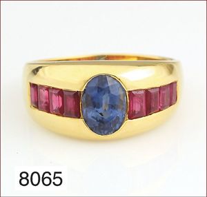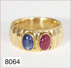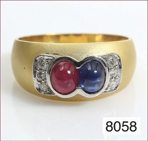 Ring, GG/WG 750/000, 1 Rubincab. ca. 0,80 ct, 1 Saphircab ca. 0,90ct, Brillanten ca. 0,13 ct tw-vsi , RW ca. 60
