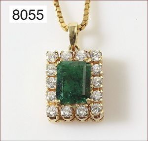 Anhänger, GG 585/000, Smaragdachteck ca. 2,3 ct, 14 Brillanten ca. 0,56 ct tw/w-si/vsi, H = 24,5 mm, Veneciakette, GG 585/000, L = 59 cm